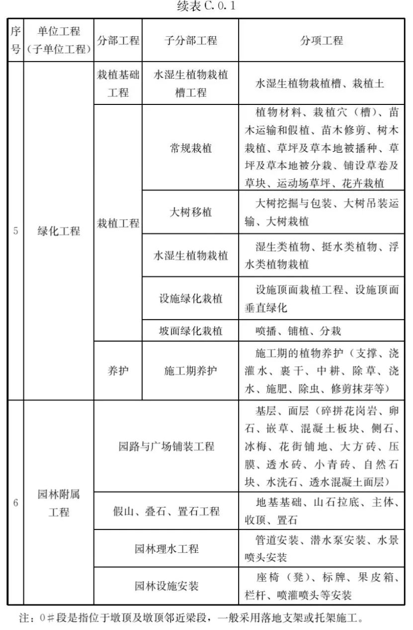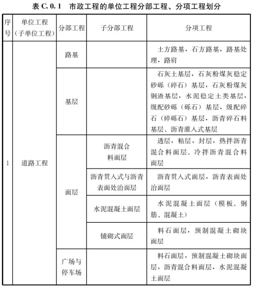 C.0.1市政工程的單位工程、分部工程、分項工程劃分應符合表C.0.1的規定。