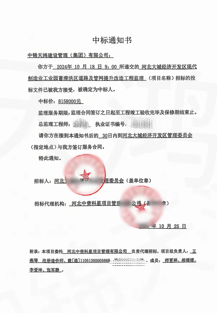 近日,河北省招標投標公共服務平臺發(fā)布了“河北大成經(jīng)濟開發(fā)區(qū)現(xiàn)代制造業(yè)工業(yè)園蓄滯洪區(qū)道路及管網(wǎng)提升改造工程中標結(jié)果”中標公示公告,經(jīng)評審專家綜合審定,中錦天鴻集團作為該項目中標單位。