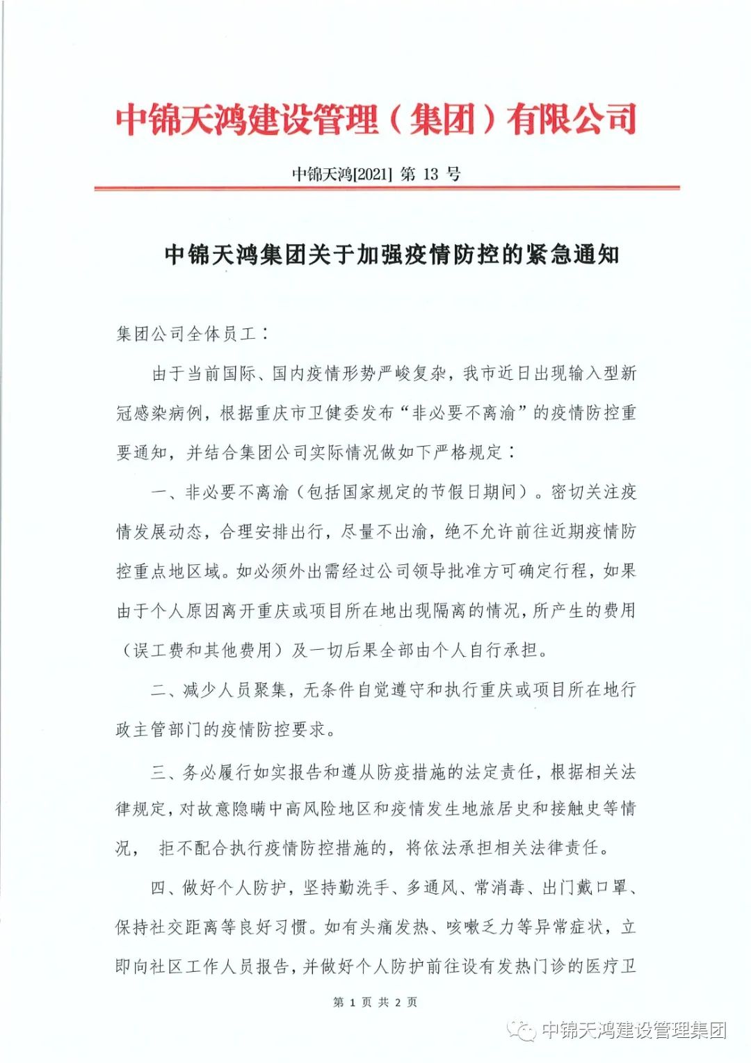 以下是中錦天鴻集團關于加強疫情防控的緊急通知: